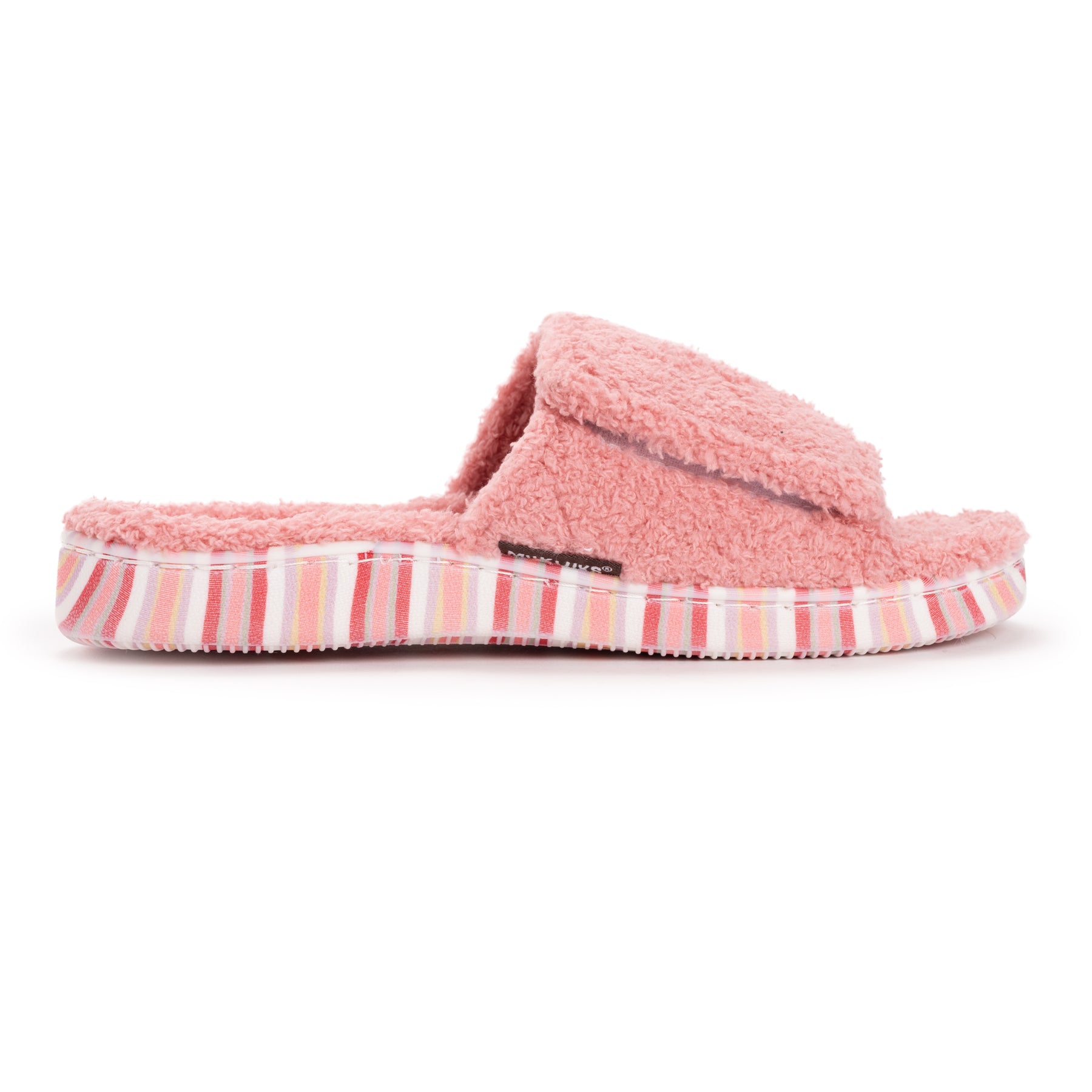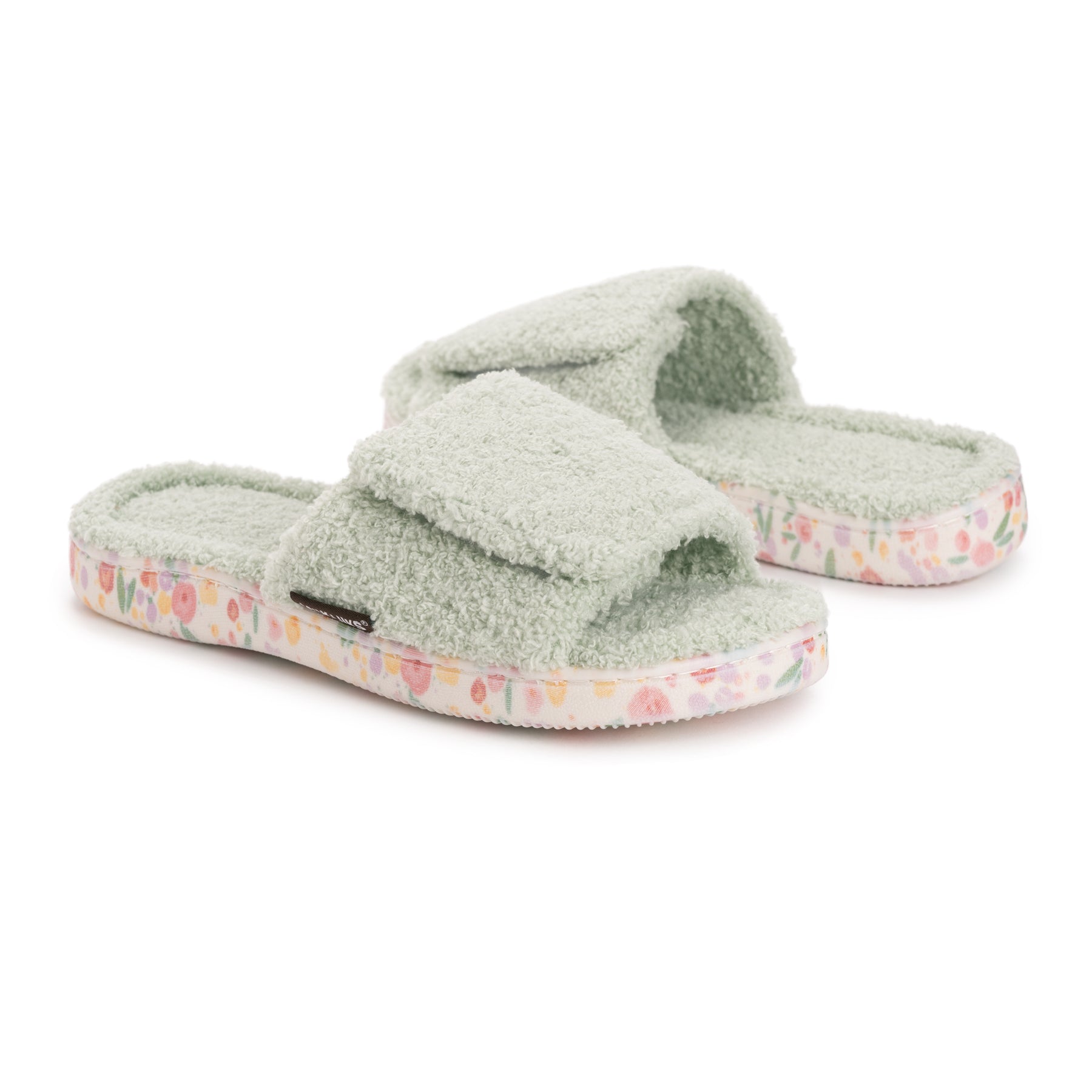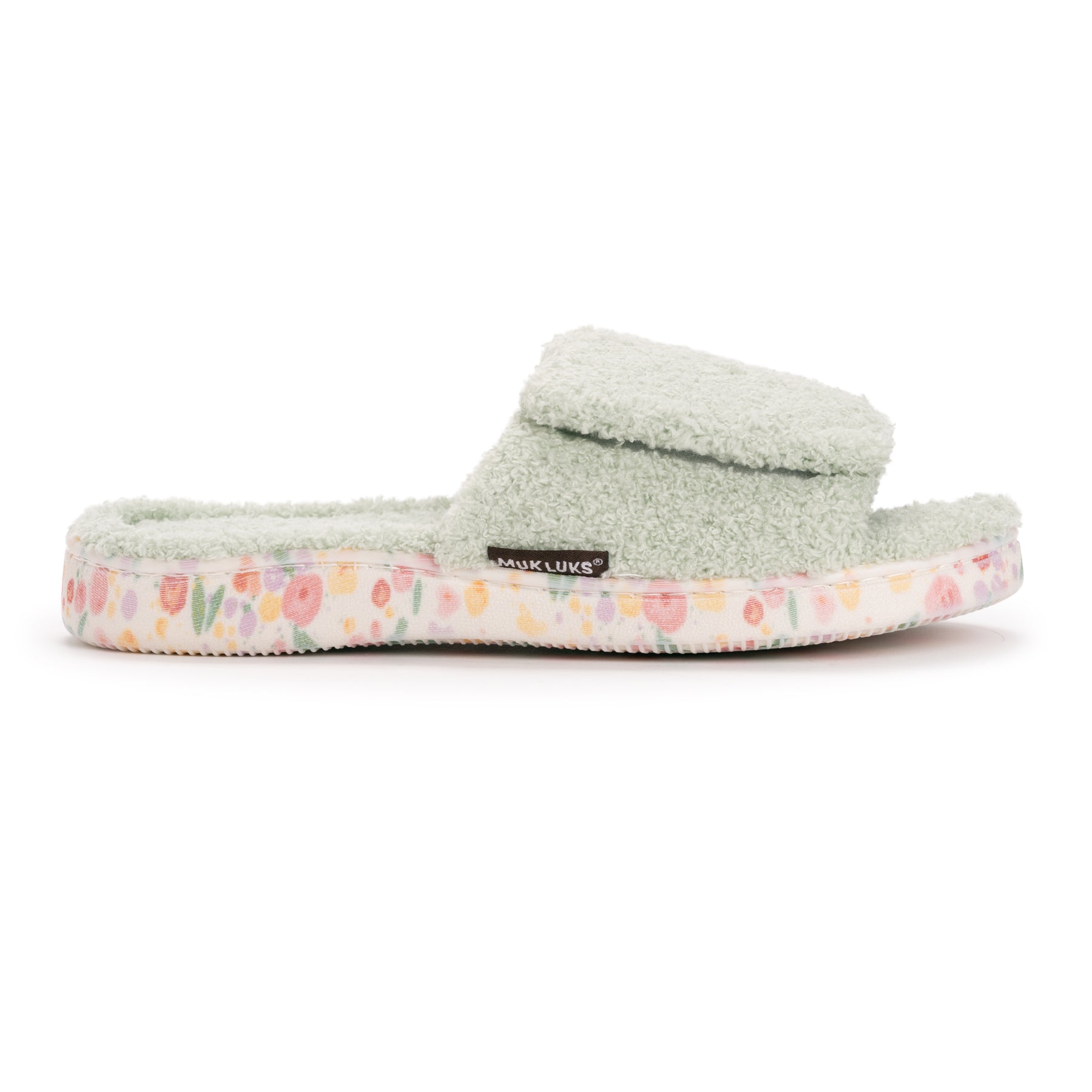 Elevate Your Comfort with MUK LUKS Women's Acacia Slippers. Enveloping your feet in soft toweling material and the memory foam insole that adds an extra layer of support, the Acacia Slippers create a cozy haven for ultimate comfort. For a personalized fit, the adjustable strap with hook and loop closure ensures a secure and tailored experience. Along with a printed outsole, these slippers make a fashionable statement with every step. Wipe with damp cloth, do not bleach, dry flat.