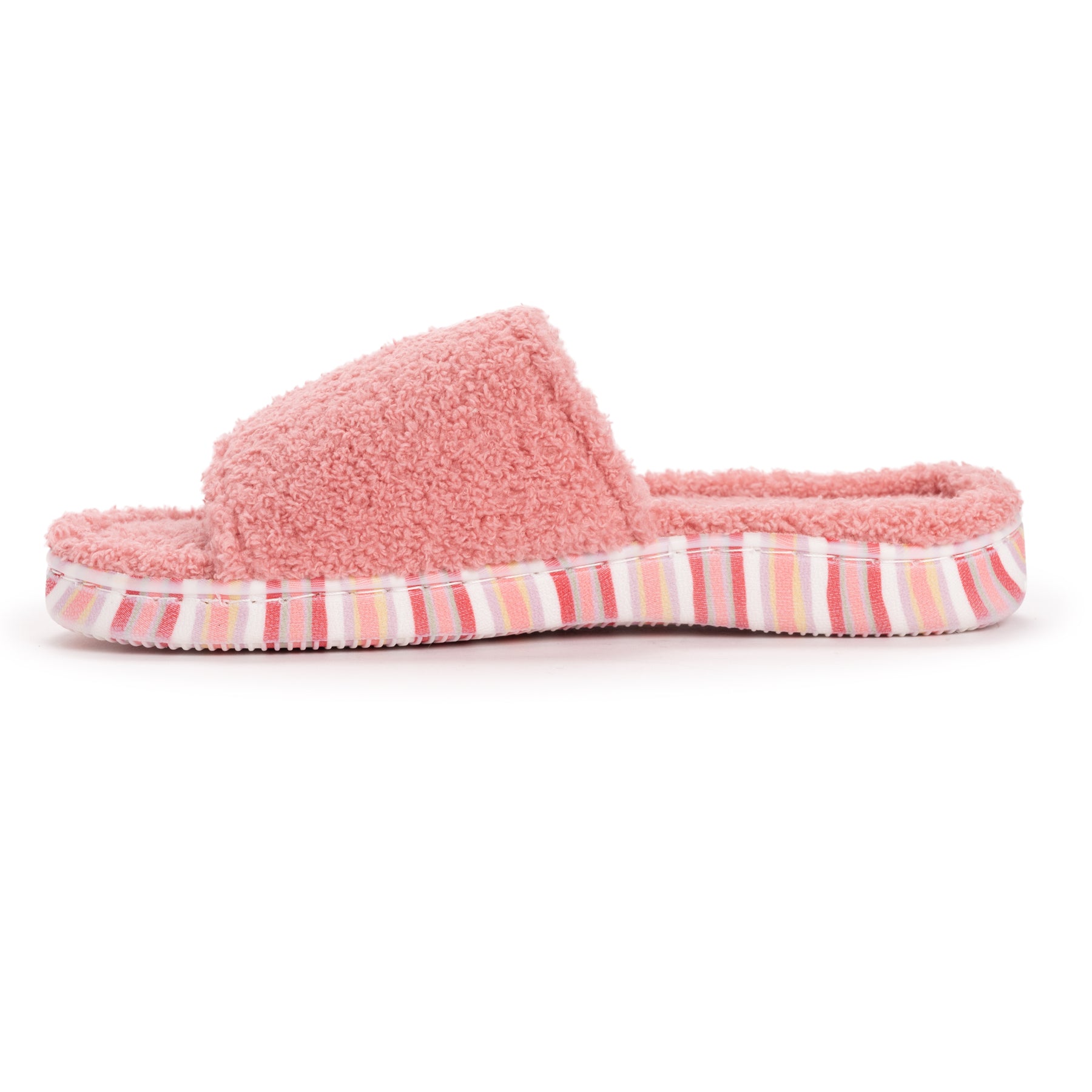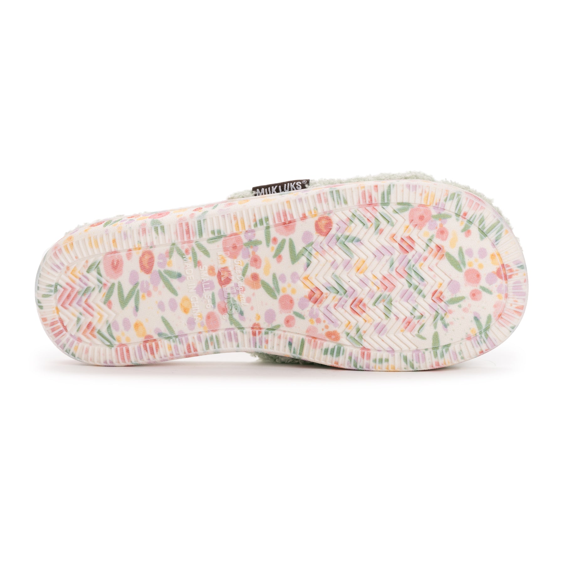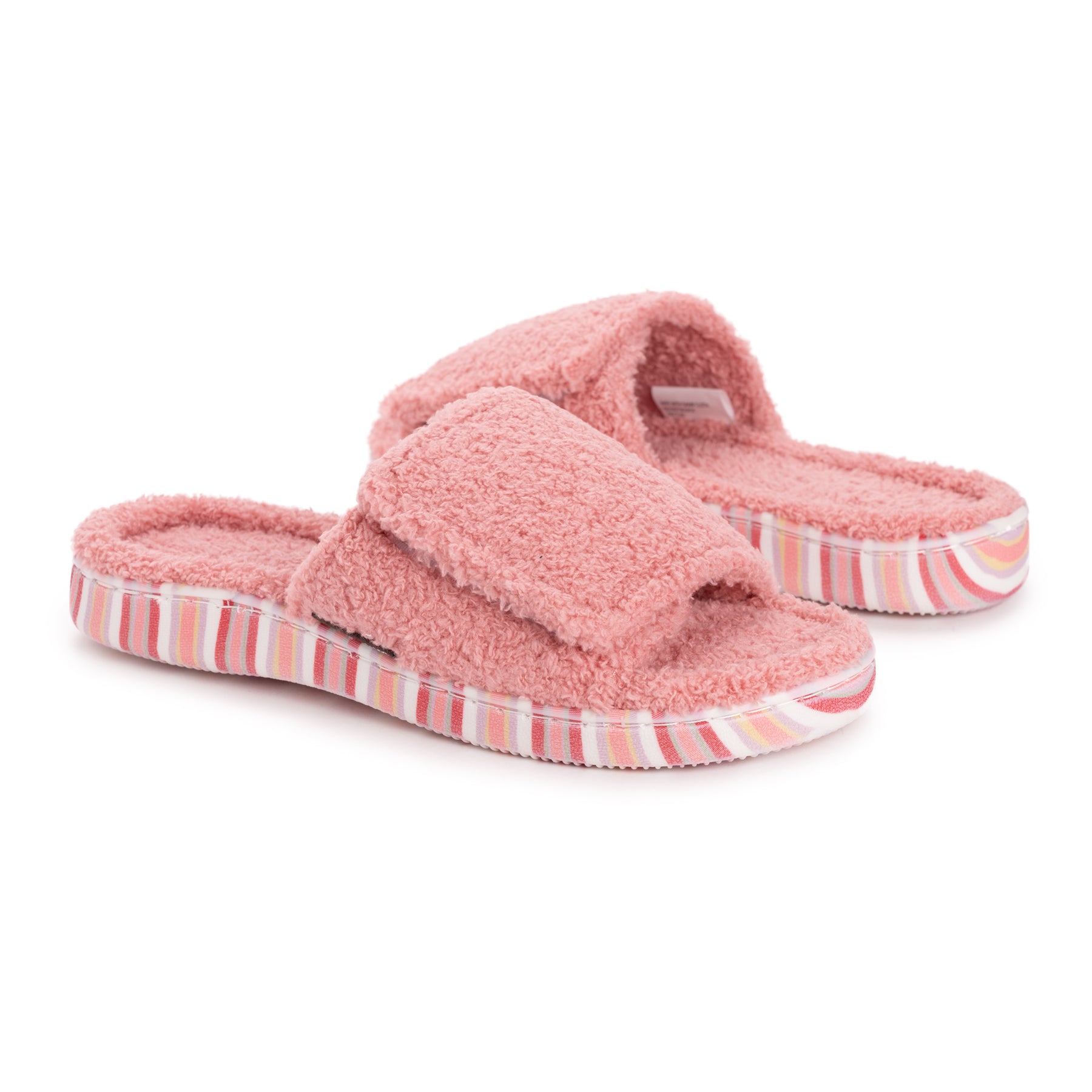 Elevate Your Comfort with MUK LUKS Women's Acacia Slippers. Enveloping your feet in soft toweling material and the memory foam insole that adds an extra layer of support, the Acacia Slippers create a cozy haven for ultimate comfort. For a personalized fit, the adjustable strap with hook and loop closure ensures a secure and tailored experience. Along with a printed outsole, these slippers make a fashionable statement with every step. Wipe with damp cloth, do not bleach, dry flat.