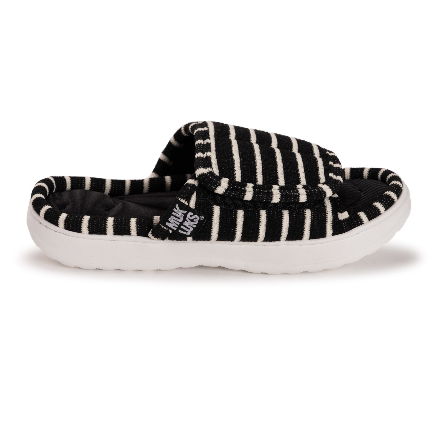 Step into comfort with the stylish MUK LUKS Raelynn slide slipper featuring a supportive plush memory foam cushioning for all-day support. The soft toweling fabrication adds a cozy, textured feel, while the lightweight EVA outsole ensures durability and flexibility. The convenient hook-and-loop closure ensures a perfect fit for lounging or casual wear; this design combines comfort and modern flair effortlessly.